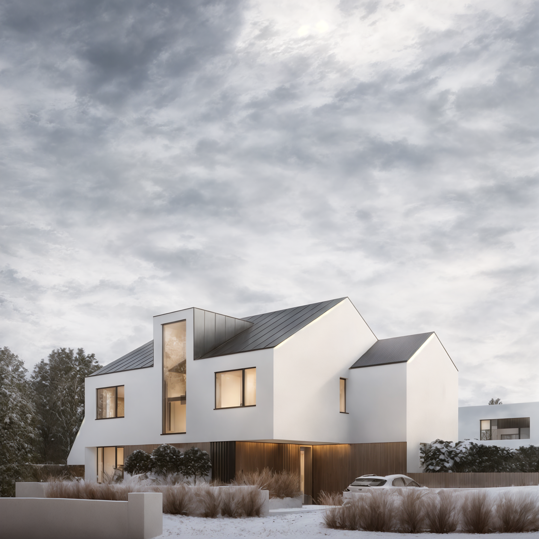 The design aims to create a harmonious blend between the new development and the existing structures, ensuring that the new houses complement the main house and the protected structure. The thoughtful selection of materials and the strategic planning of the houses aim to provide a high-quality living environment while respecting the historical and architectural significance of the surrounding buildings. The development not only enhances the area's aesthetic appeal but also ensures that the new houses fit seamlessly into the existing urban fabric.